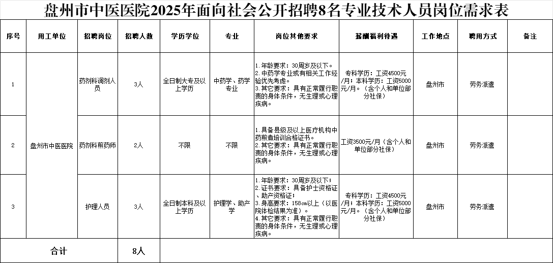 盘州市中医医院2025年拟面向社会公开招聘药剂科调剂人员3名、药剂科煎药师2名、护理人员3名,共计8名。具体招聘职位详见附件1《盘州市中医医院2025年面向社会公开招聘8名专业技术人员岗位需求表》。