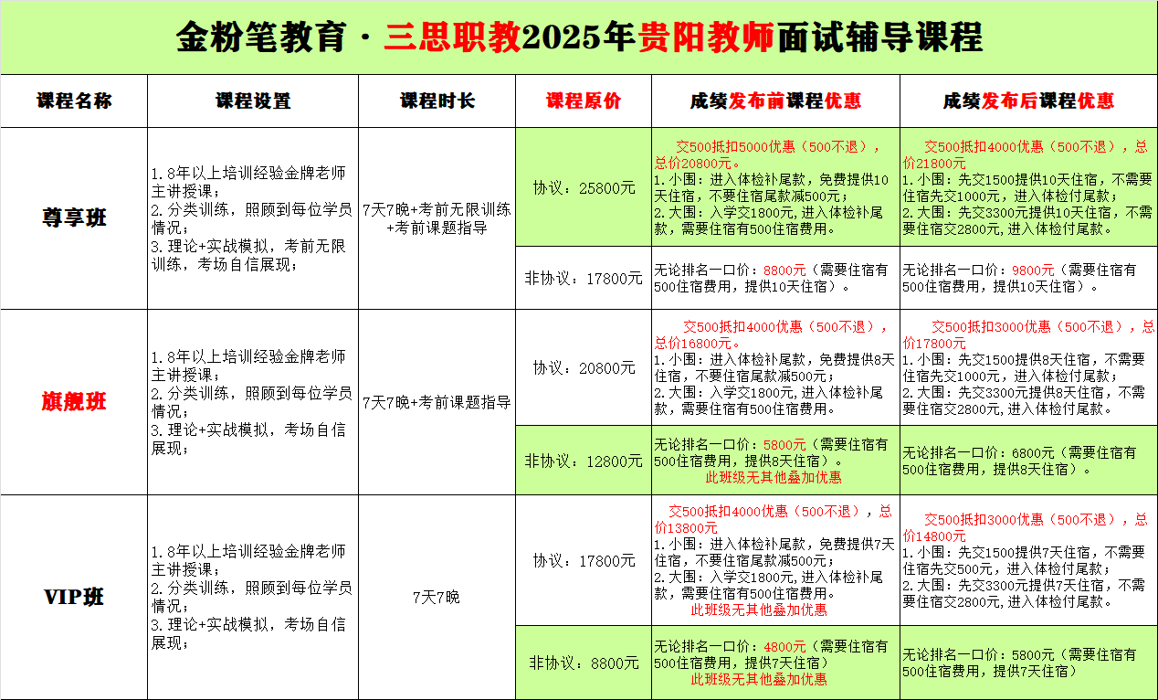 贵州金粉笔2025年贵阳教师面试培训班课程来了,具体班次及费用详见面试课程表,贵阳教师面试培训:试教+考题辅导。在笔试成绩公布前和笔试排名公布前预约贵阳教师面试班,可享对应课程优惠,贵阳教师面试培训班预约及详情咨询:13368515037(微同)。