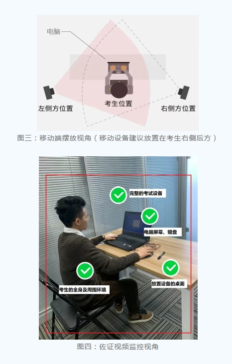 (3)考试开始前,考生需要先登录移动端“智考通”,用前置摄像头360度环绕拍摄考试环境,随后将移动设备固定在能够拍摄到考生全身(含侧面)、考试桌面、完整的考试设备(电脑屏幕和键盘等)、考生双手动作(考生行为)及考生周围环境的位置上继续拍摄考试全程(详见说明书中《智考通操作手册》《智考云在线考试规范》)。请考生注意,视频拍摄角度不得存在盲区,不得无故中断视频录制,考试视频数据不得缺失,不得出现影响考务人员判断本场考试有效性等情况,否则将影响成绩的有效性,由考生自行承担后果。
