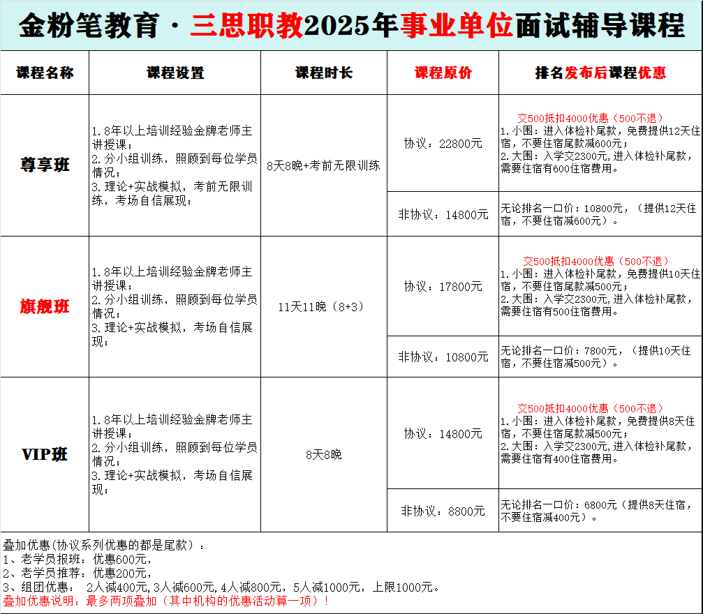 贵州金粉笔.三思职教2025年贵州事业单位面试培训班开始了,事业单位面试培训班有协议班、实战班和一对一班次,满足各类考生对于事业单位面试培训时长要求,班次不同,培训时长和费用不同,事业单位面试培训班全程主讲老师带领,严管督学,三分理论,七分实战。