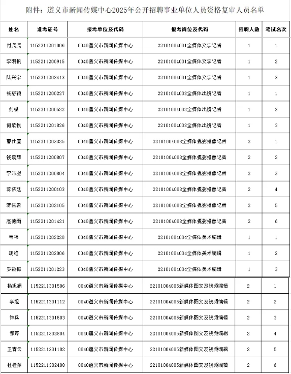 附件:遵义市新闻传媒中心2025年公开招聘事业单位人员资格复审人员名单
