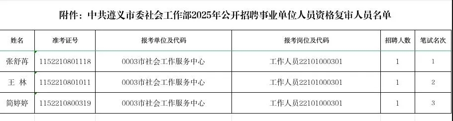 进入资格复审人员名单见《中共遵义市委社会工作部2025年公开招聘事业单位人员资格复审人员名单》(见附件)。