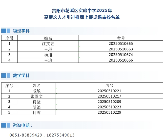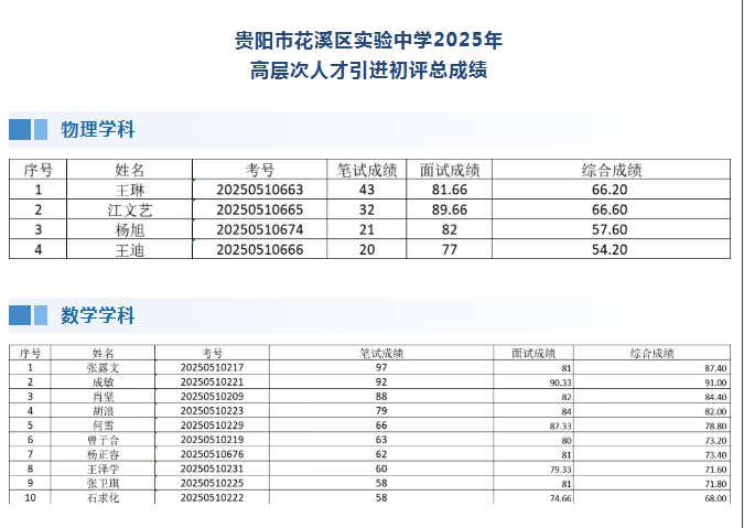 根据《第十三届贵州人才博览会贵阳贵安事业单位引进高层次及急需紧缺人才工作方案》《花溪区事业单位2025年引进高层次人才工作实施方案》要求,贵阳市花溪区实验中学2025年度高层次人才引进专业测试初评试教成绩及进入上级人事部门现场评审名单如下: