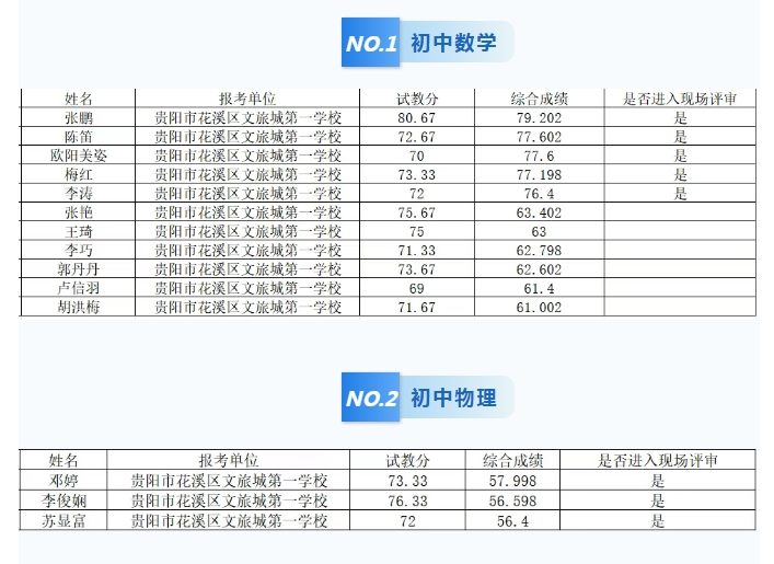 根据《第十三届贵州人才博览会贵阳贵安事业单位引进高层次及急需紧缺人才工作方案》《花溪区事业单位2025年引进高层次人才工作实施方案》要求,贵阳市花溪区文旅城第一学校人才引进专业测试初评试教成绩及进入现场评审名单如下: