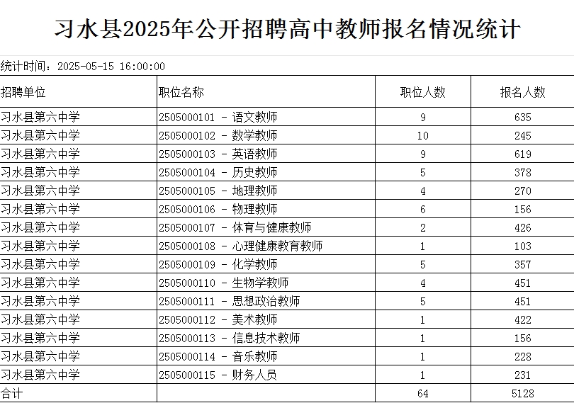 2025年习水县高中教师招聘5月15日报名情况统计(报名人数5128人)