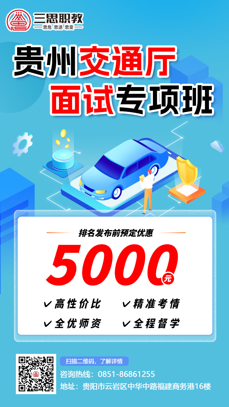 贵州三思职教2025年贵州交通厅面试培训班优惠来了,在贵州交通厅笔试成绩排名公布前预约面试班,不论分差和大小围,可0元入学,班次多样,不管有无面试基础,都有对应的班次可学习。贵州交通厅面试班预约及详情咨询:13368515037(微同)。