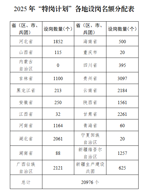 (二)招聘数量。2025年全国计划招聘“特岗计划”教师20976名,各省(区、市)和新疆生产建设兵团的招聘名额见2025年“特岗计划”各地设岗名额分配表(附件)。