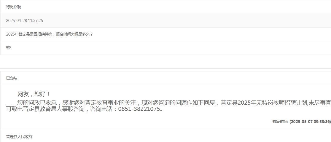 普定县2025年无特岗教师招聘计划。