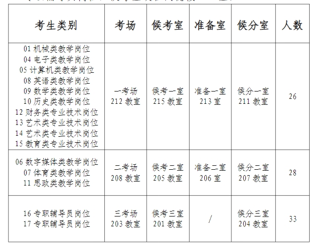 (二)面试地点:贵州省都匀市旗山大道北段8号贵州机电职业技术学院。面试设三个考场,一考场为 01机械类、04 电子类、05 计算机类、08 英语类、09 数学类、10 历史类、12 财务类、13 艺术类、14 艺术类、15 教育类岗位,候考室设在同德楼215 室;二考场为 06 数字媒体类教学岗位、07 体育类教学岗位和 11 思政类教学岗位,候考室设在同德楼 205 室;三考场为 16、17 专职辅导员岗位,候考室设在同德楼 201 室。