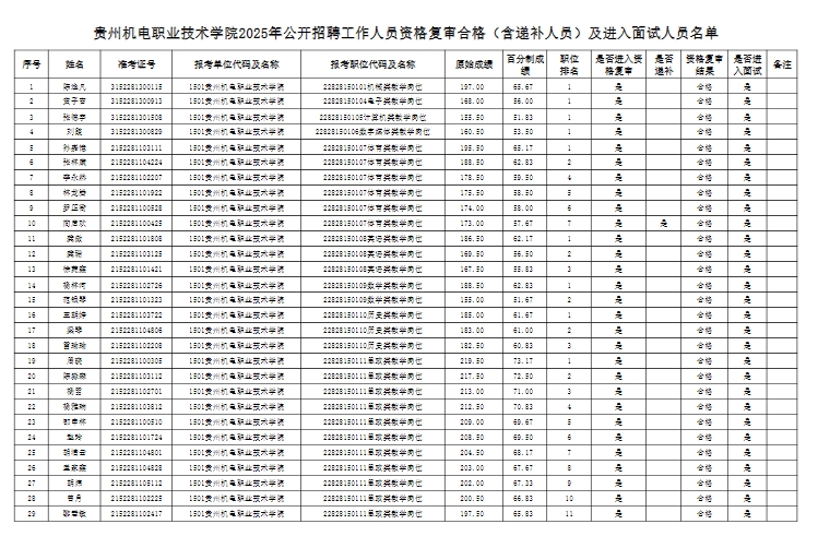 1.贵州机电职业技术学院2025年公开招聘工作人员资格复审合格人员及进入面试人员名单