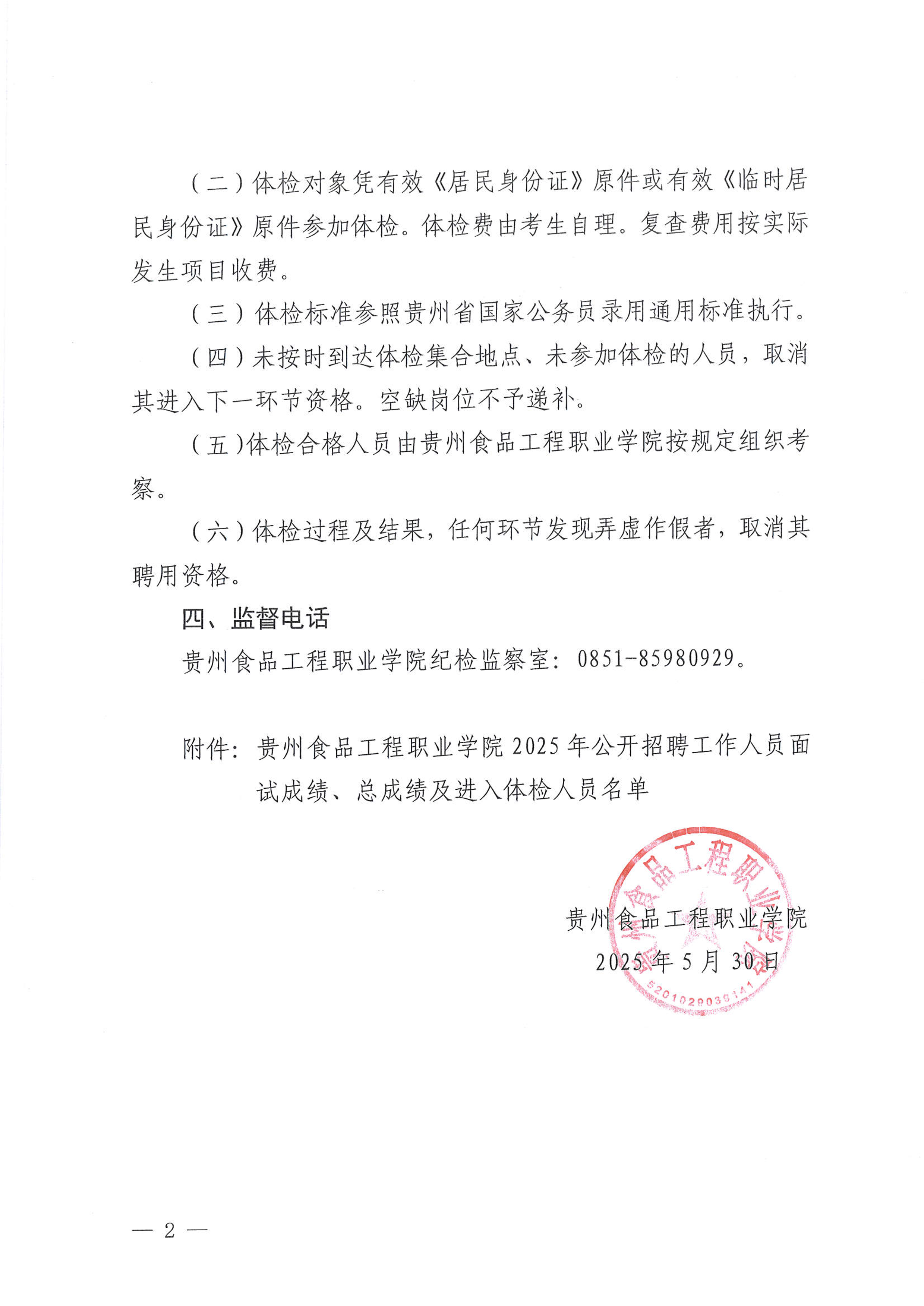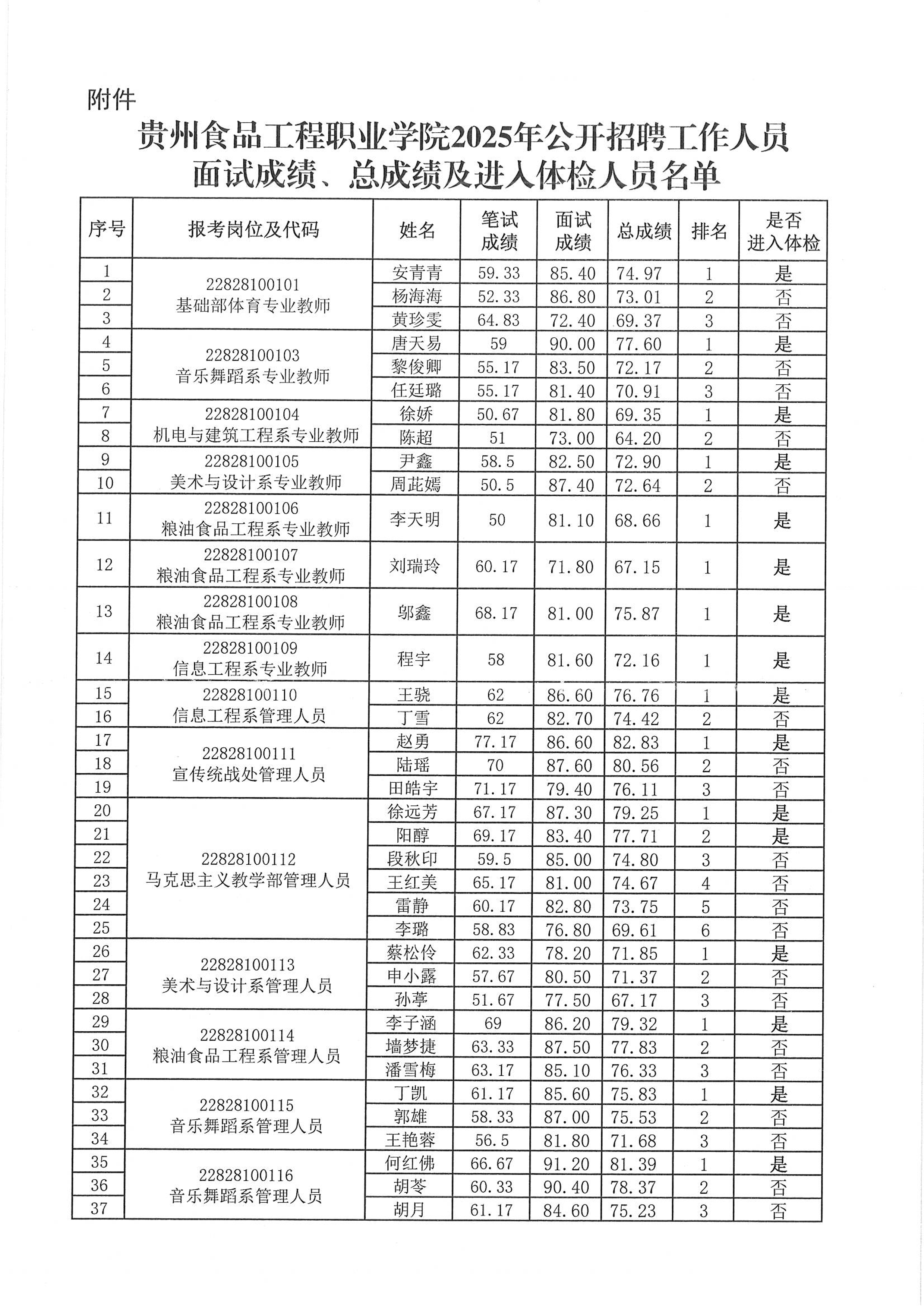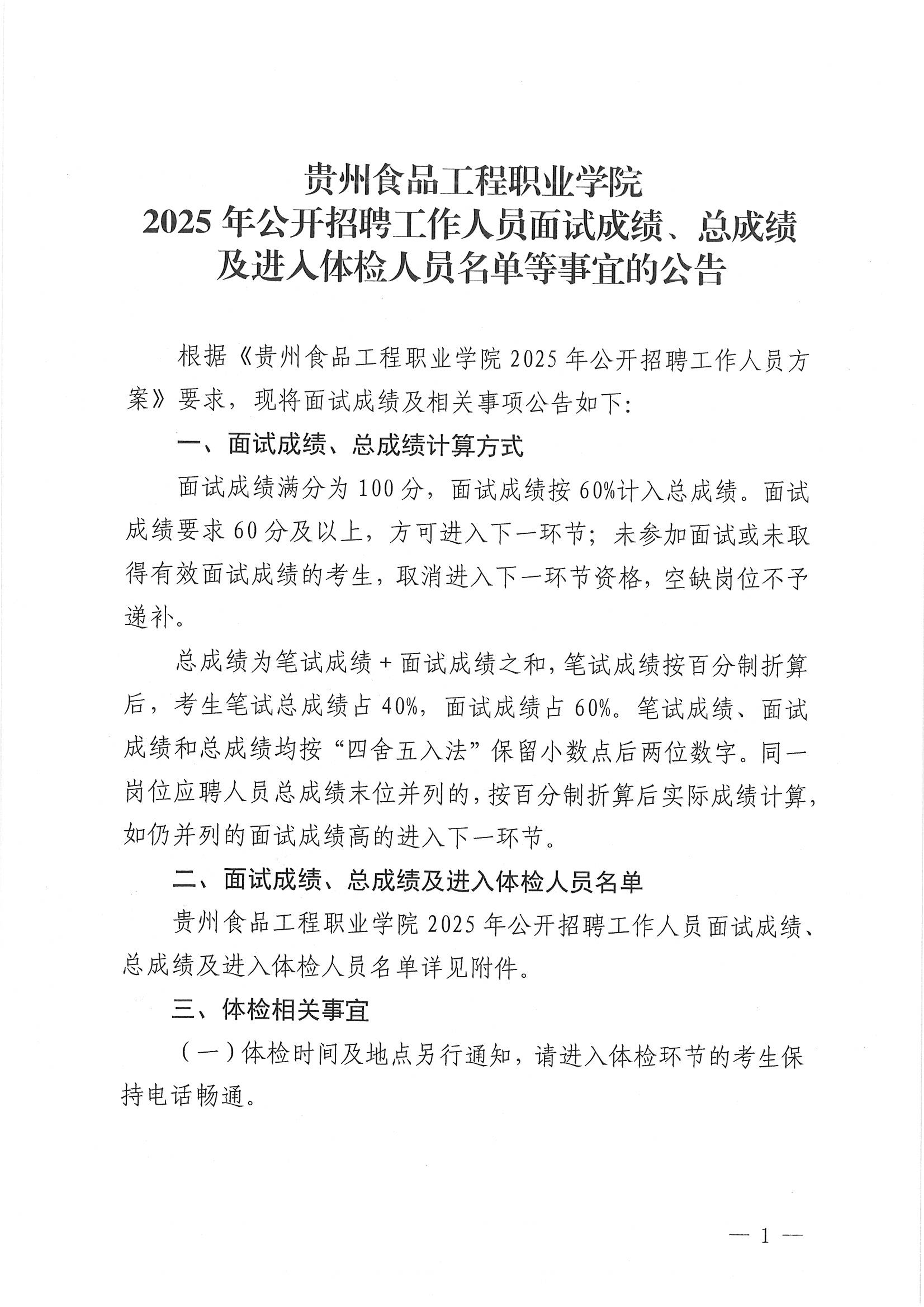 贵州食品工程职业学院2025年公开招聘工作人员面试成绩、总成绩及进入体检人员名单等事宜的公告