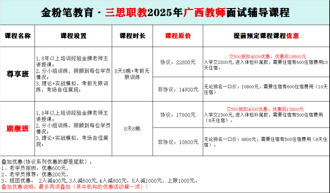 金粉笔教育.三思职教2025年广西教师面试培训班课程来了,协议班和非协议班都有,提前预订课程可享对应课程优惠,8天8晚,培训紧跟面试考情。广西教师面试培训班预定或咨询:13368515037(微同)。