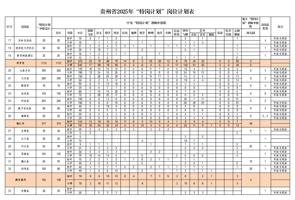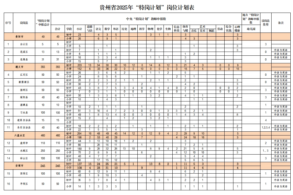 贵阳市特岗人数49名、遵义市特岗人数355名、安顺市特岗人数245名、六盘水市特岗人数460名、毕节市特岗人数1110名、铜仁市特岗人数371名、黔东南州特岗人数162名、黔南州特岗人数341名、黔西南州特岗人数80名。
