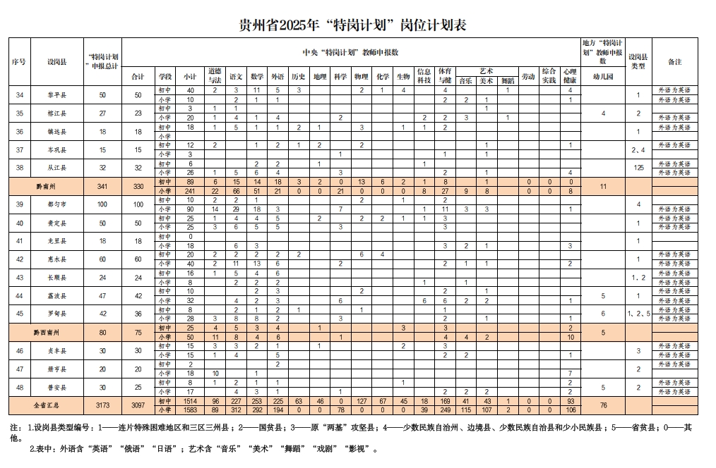 2025年贵州特岗教师人数3173人,其中初中特岗教师1514人,小学特岗教师1583人,幼儿特岗教师76人。