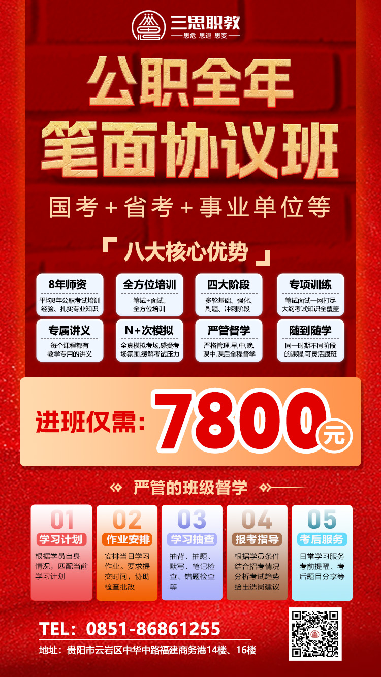 贵州金粉笔.三思职教2026年贵州省考全年班,公考无忧班(笔试+面试),前期入学仅需7800元,进入体检后再补尾款。国考+省考+事业单位等课程,一年均可学,上岸机会更多,越早报名学习,课时更多更划算。2026年贵州省考课程预约及咨询:13378508157(微同)。