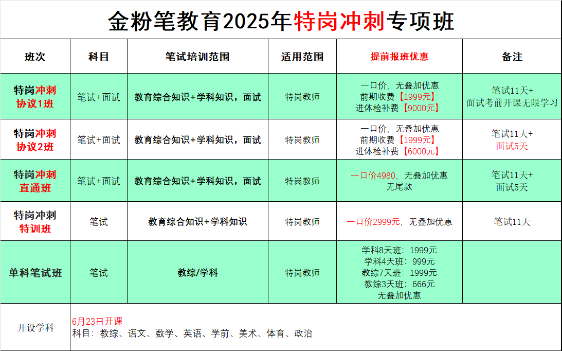 贵州金粉笔2025年特岗教师笔试冲刺班来了,开课时间详情咨询教务老师,贵州特岗冲刺班次有协议班、直通班、特训班、学科专业知识班,现在预订或报班,可享相关课程优惠,特岗教师笔试培训内容教育综合知识+学科专业知识,2025年贵州特岗教师笔试冲刺班预订及详情咨询:13368515037(微同)。