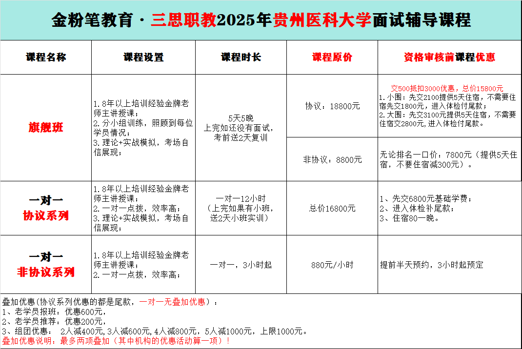 贵州金粉笔2025年贵州医科大学辅导员面试专项班课程来了,高校辅导员专项面试,学至考前,针对性培训,紧跟面试考情,资深师资全程主讲,小班授课。贵州医科大学辅导员面试班预约和咨询:13368515037(微同)。