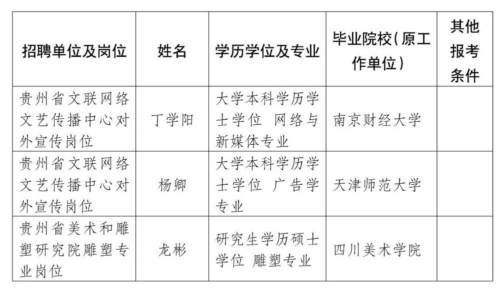 根据《贵州省文学艺术界联合会所属事业单位2025年公开招聘事业单位工作人员方案》,经发布公告、报名、笔试、资格复审、面试及总成绩计算等程序并体检、考察合格,现将拟聘用人员名单予以公示。公示期间,如有问题,请向我单位反映。