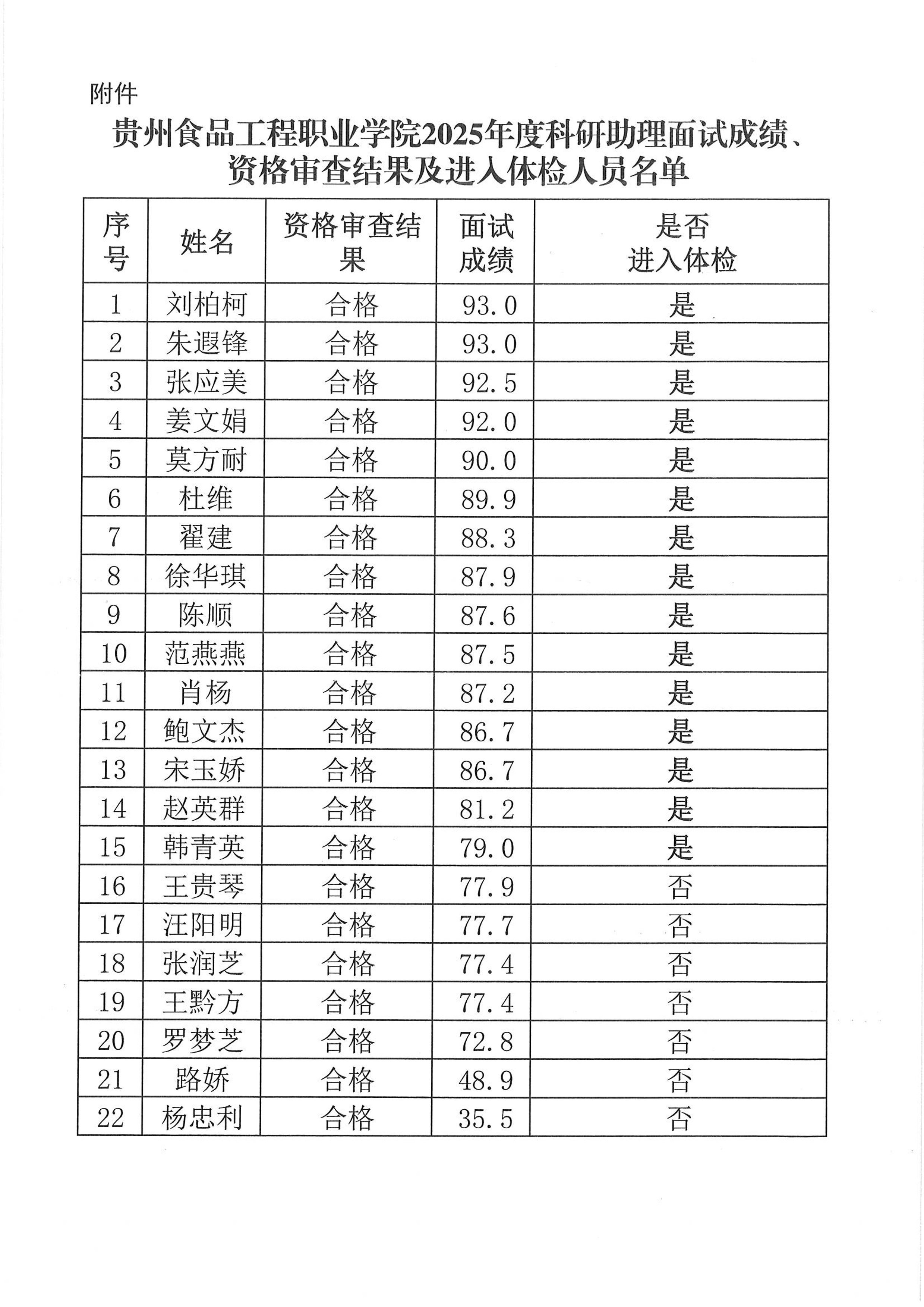 附件:贵州食品工程职业学院2025年度科研助理面试成绩资格审查结果及进入体检人员名单