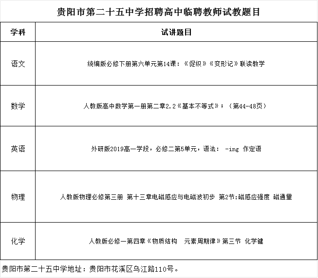 根据《贵阳市第二十五中学招聘高中临聘教师公告》要求,我校对报名考生进行资格审查,通过资格审查人员已电话通知,现将试教题目进行公布。