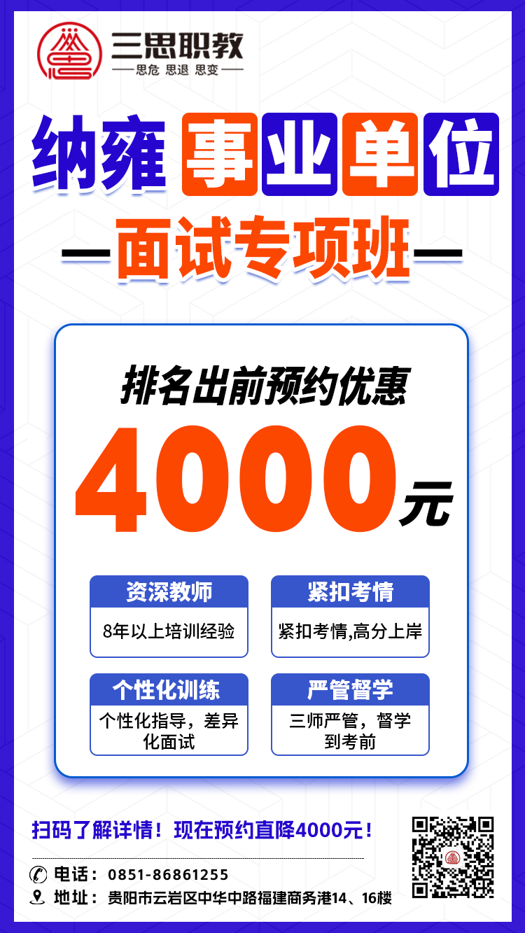 贵州金粉笔.三思职教2025年纳雍县事业单位面试培训班来了,在笔试成绩排名前预约面试课程,可享最大面试课程活动优惠,纳雍县事业单位面试培训班预约或咨询:13368515037(微同)。