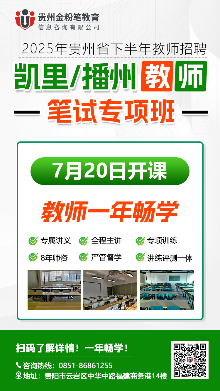 贵州金粉笔2025年凯里市、播州区教师笔试班课程来了,开课时间7月20日,培训科目《教育综合知识》,一年畅学班,全年笔面均可学,凯里市、播州区教师笔试班预约及咨询:13368515037(微同)。