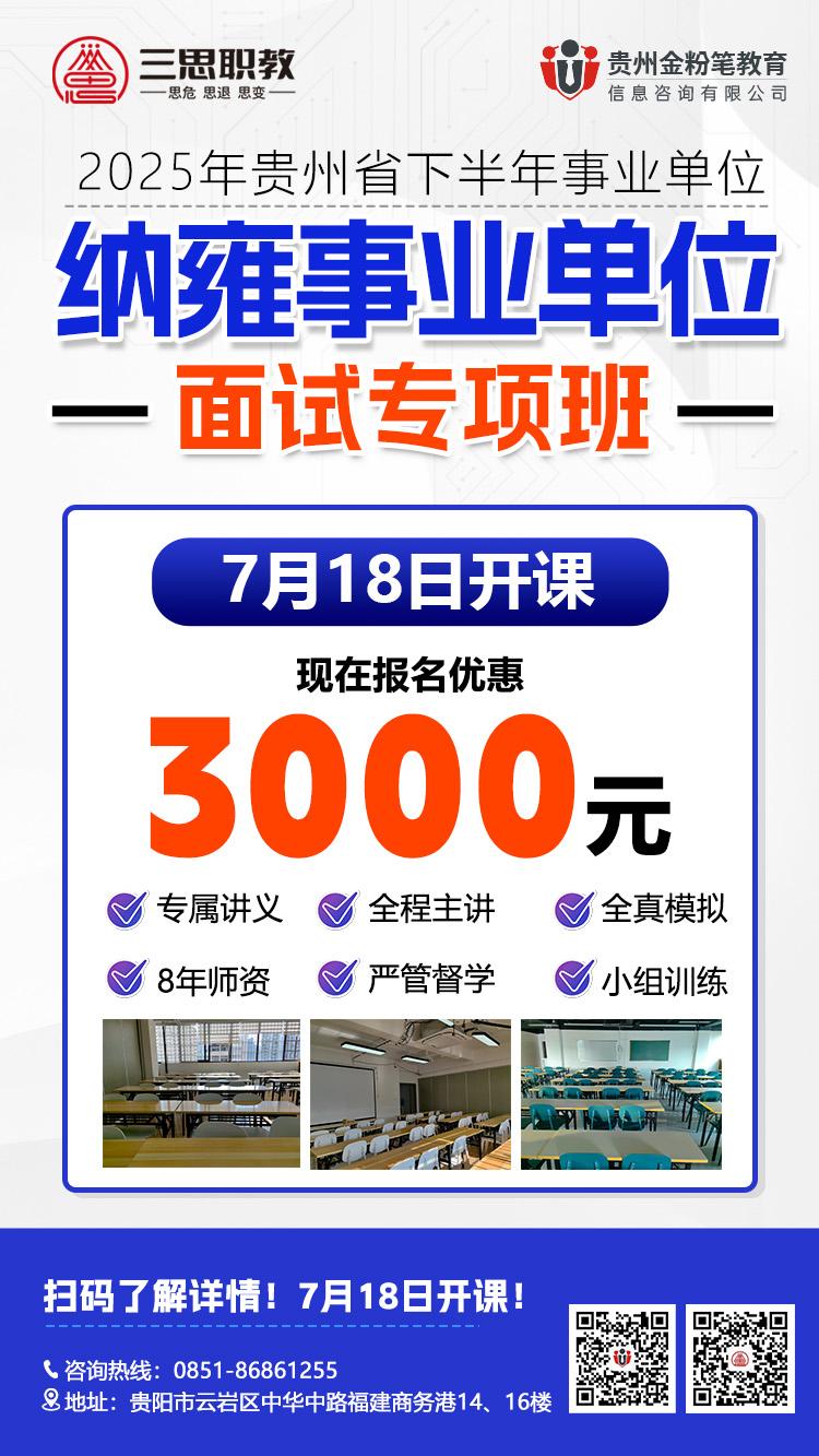 贵州金粉笔.三思职教25年纳雍县事业单位面试培训班来了,开课时间7月18日,纳雍县事业单位面试班预约及咨询:13368515037(微同)。