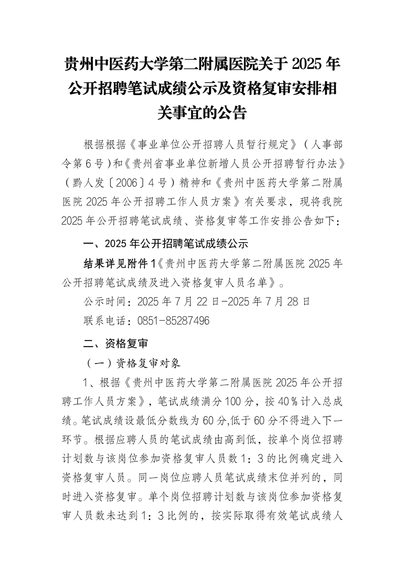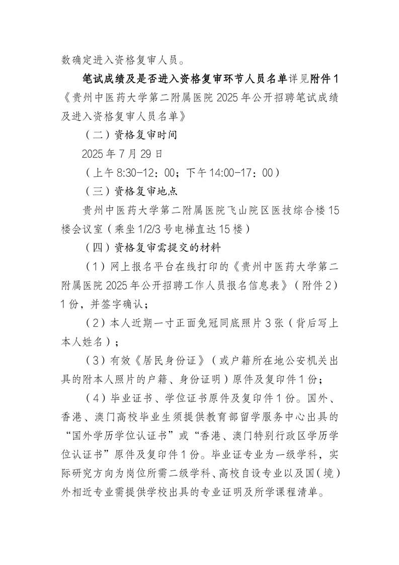 2025年贵州中医药大学第二附属医院招聘笔试成绩公示及资格复审公告(7.29复审)