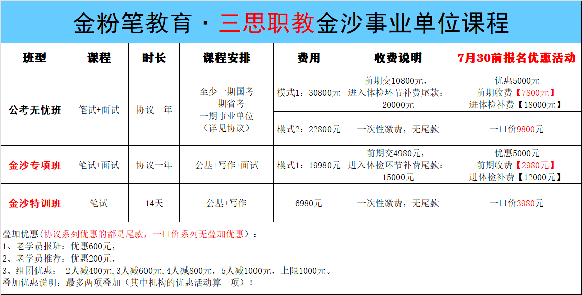 贵州三思职教2025年金沙县事业单位笔试班课程来了,开课时间7月30日,公基+写作,14天课程,在7月30日前预约课程或报班,入学只需2980元。贵州金沙县事业单位笔试班预约及咨询:13378508157(微同)。