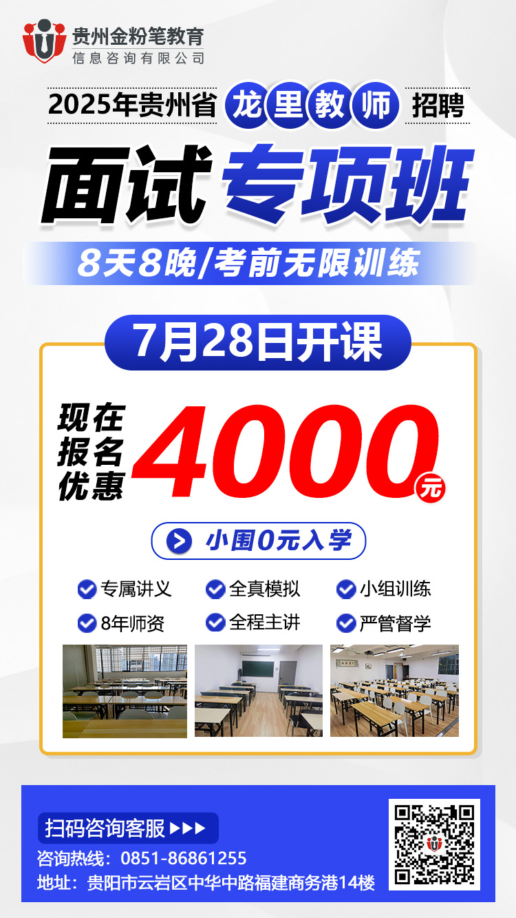 贵州金粉笔2025年龙里县教师面试班来了,7月28日开课,最高可享4000元优惠,培训内容试讲。龙里县教师面试班预约及咨询:13368515037(微同)。