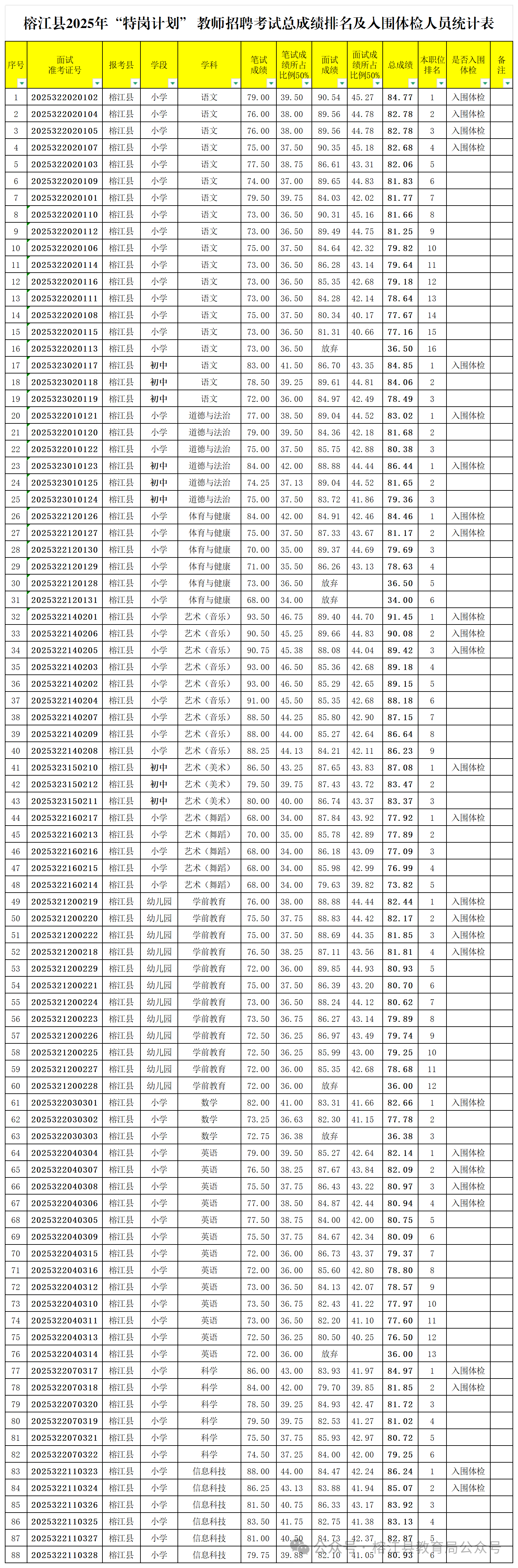 榕江县2025年“特岗计划”教师招聘笔试、面试工作已结束,现将总成绩排名及入围体检事宜公告如下: