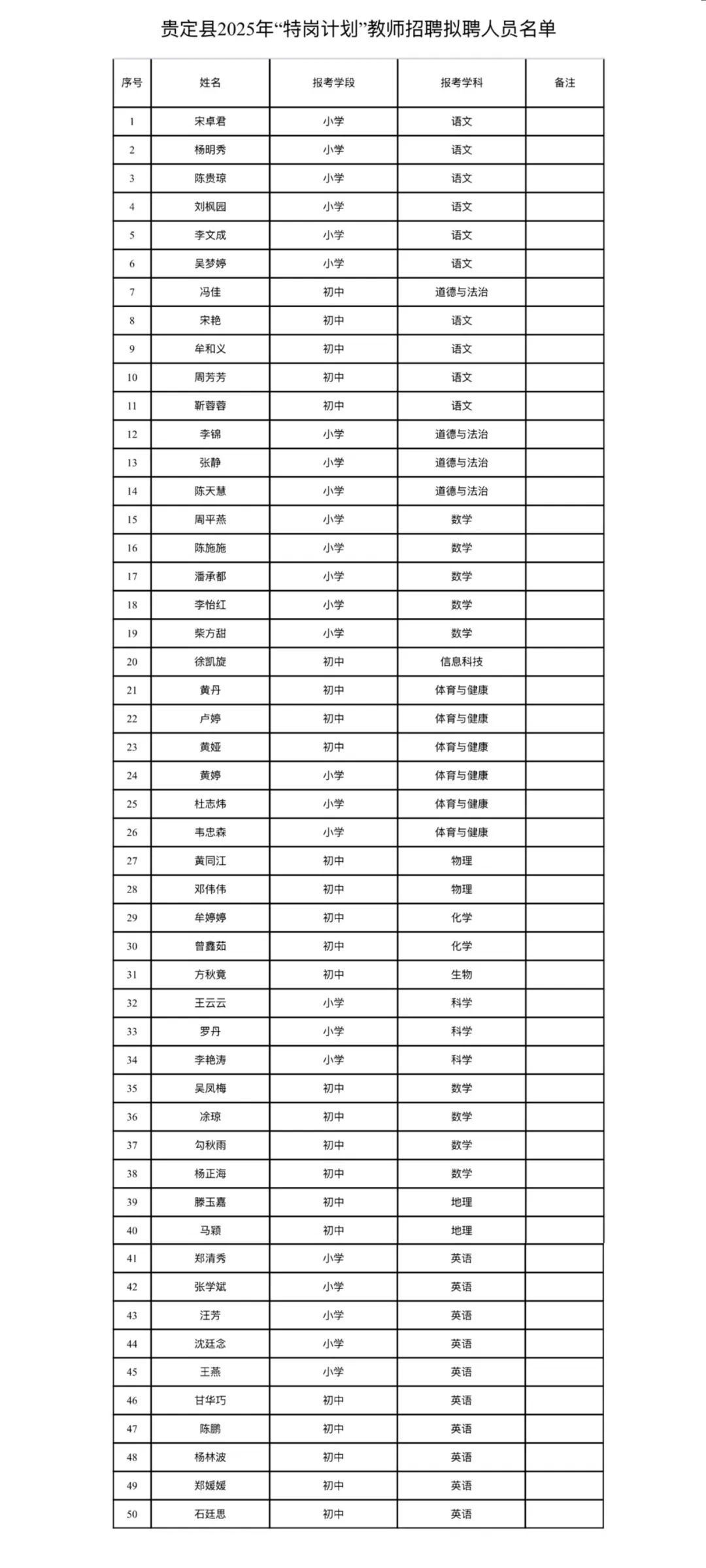 根据《省教育厅 省委编办 省财政厅 省人力资源社会保障厅关于印发〈贵州省2025年“特岗计划”实施方案〉的通知》(黔教函〔2025〕28号)和《州教育局 州委编办 州财政局 州人力资源社会保障局关于印发〈黔南州2025年“特岗计划”工作方案〉的通知》(黔南教函〔2025〕14号)等文件精神,结合《贵定县2025年“特岗计划”工作方案》相关规定,经报名、资格审查、笔试、面试、体检、考察等程序,现对50名拟聘用人员名单进行公示。
