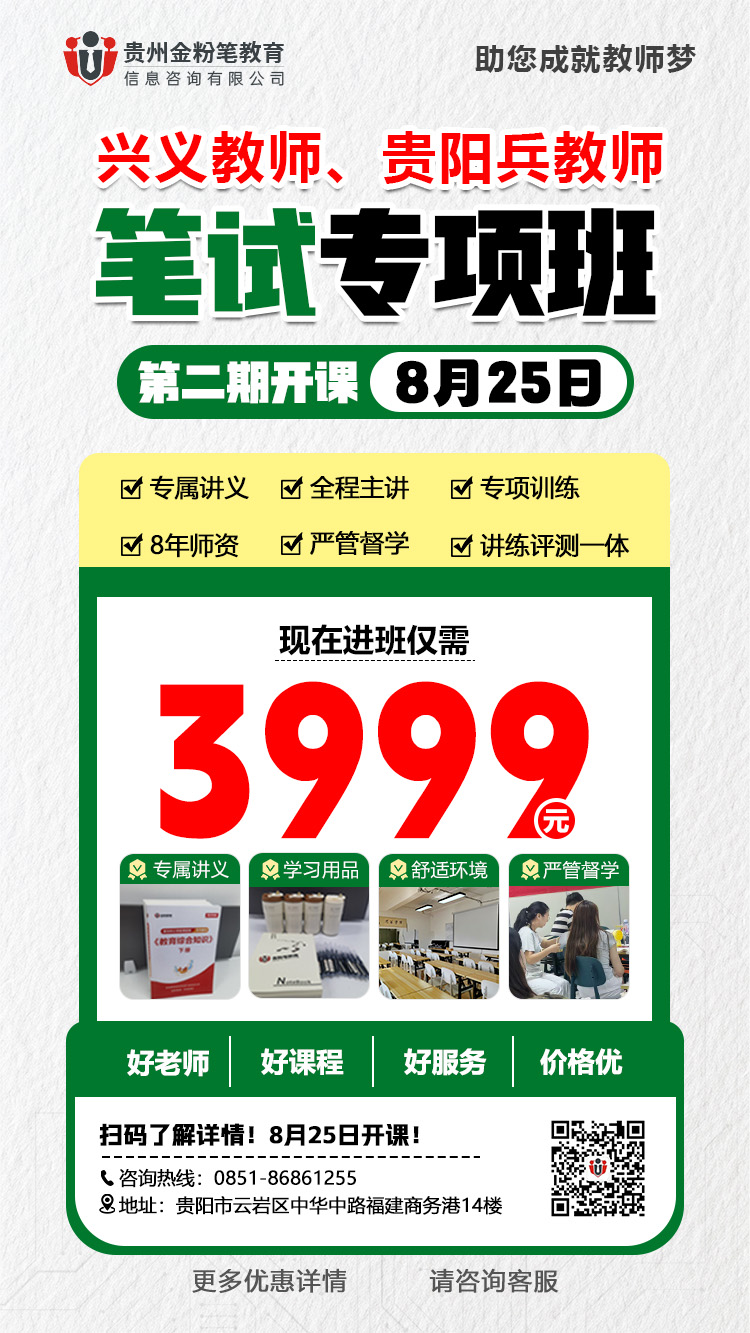 贵州金粉笔2025年兴义市教师、贵阳市兵教师笔试班开课优惠来了,开课时间8月25日,在开课前报班可享优惠。兴义市教师、贵阳市兵教师笔试班预约及咨询:13368515037(微同)。