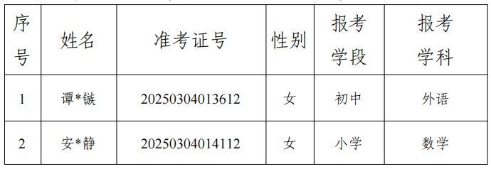 钟山区2025年“特岗计划”教师招聘人员已于2025年8月4日完成体检,并于2025年8月19日完成政审考察工作。报考初中外语、小学数学岗位各一名考生放弃钟山区2025年“特岗计划”教师招聘入职考察资格;按照《六盘水市钟山区2025年农村义务教育阶段学校教师特设岗位计划招聘方案》规定:空缺的名额,可以按总成绩高分到低分排名顺序依次递补,总成绩相同的,满足优先录取条件的进入体检,均满足或均不满足优先录取条件的依次以笔试成绩为依据,从高分到低分确定递补体检人员,具体递补人员情况如下: