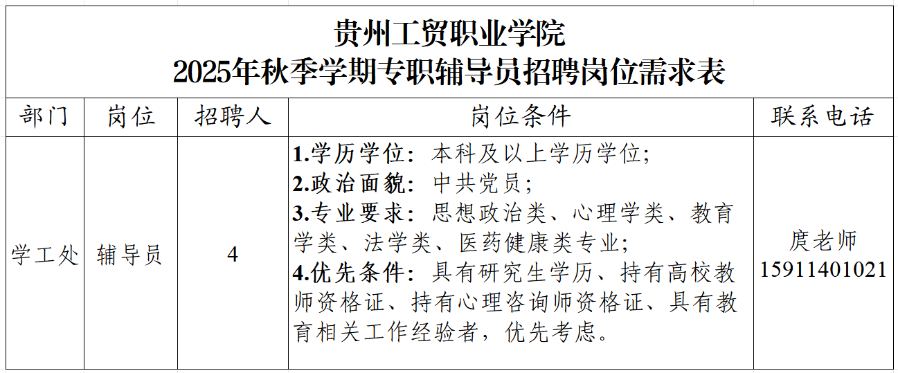 根据工作需要,我校拟面向社会公开招聘专职辅导员4名,详见附件:贵州工贸职业学院2025年秋季学期专职辅导员招聘岗位需求表。海外院校毕业生取得的学历学位证书应获得国家教育部认证、2025年普通高校应届毕业生未取得毕业证书、学位证书的可先行报名及笔试、面试,经笔试、面试、体检、考察、公示并于2025年12 月 31 日之前取得毕业证书、学位证书的,可按规定聘用,否则不予聘用。