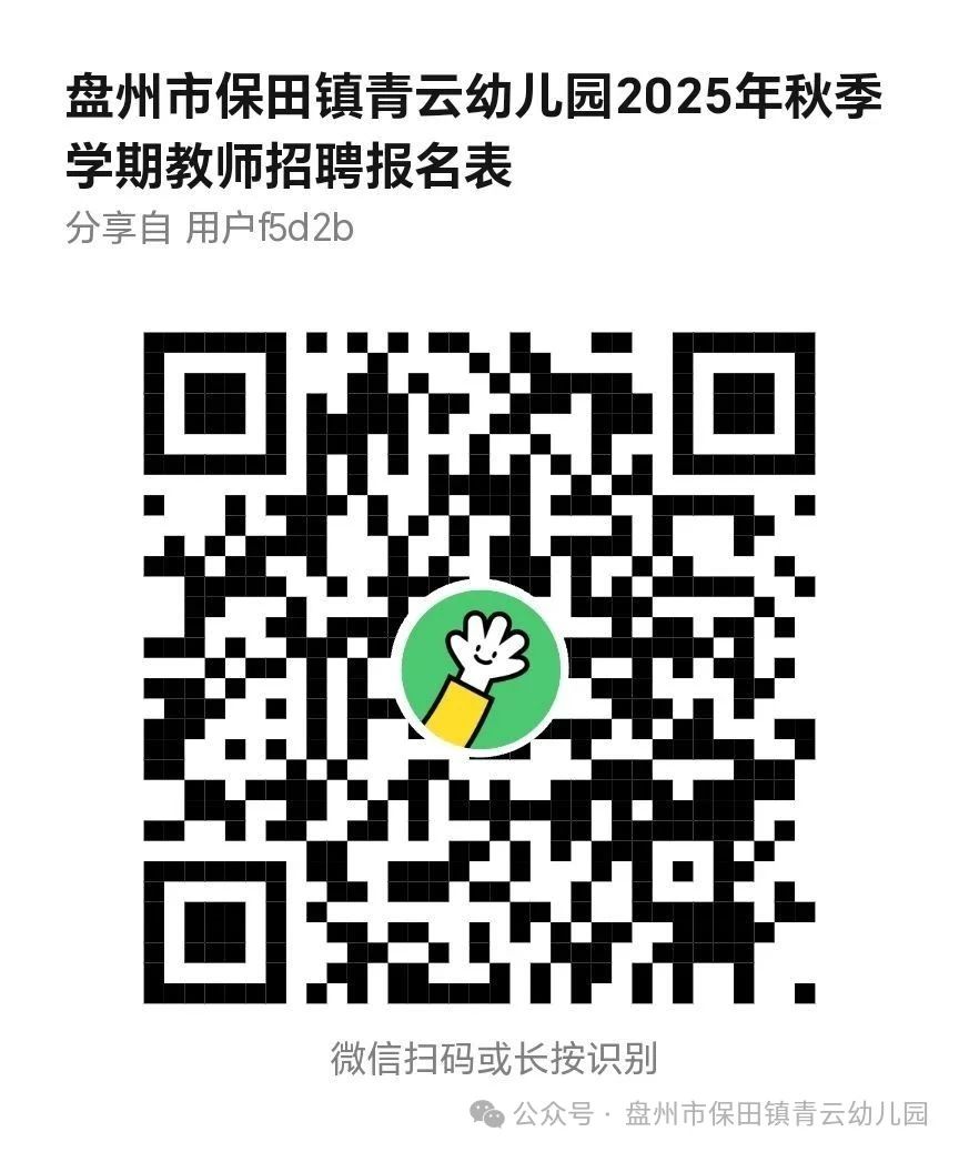 盘州市保田镇青云幼儿园位于盘州市保田中学旁,是一所由保田镇中心校直接管辖的公办幼儿园,于2019年9月正式开园,幼儿园于2024年秋季学期通过六盘水市市级示范园评估。为提前安排部署2025年秋季学期相关工作,目前根据幼儿园需要,决定面向社会招聘教师2名,现将具体事宜通知如下: