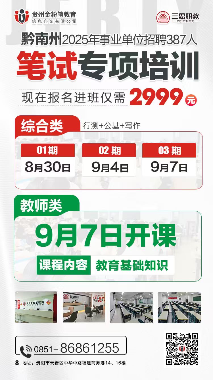 贵州三思职教2025年黔南事业单位笔试班课程来了,综合岗开课时间8月30日、9月4日、9月7日,公基+行测,17天课程,教师岗开课时间9月7日,在开课前预约课程或报班,入学只需2999元。贵州黔南事业单位笔试班预约及咨询:13378508157(微同)。