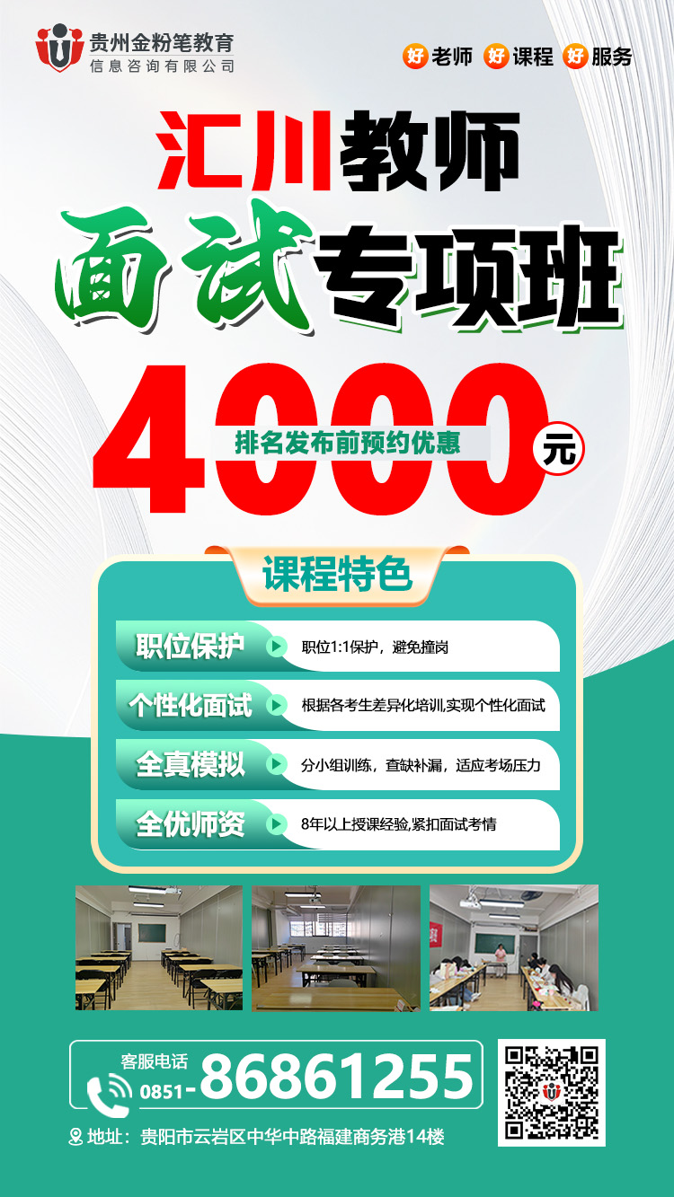 贵州金粉笔25年遵义汇川区教师面试班优惠活动来了,笔试排名公布后开课,在笔试排名公布前预约或报班,可享最大面试课程优惠,遵义汇川区教师面试班预约或咨询:13368515037(微同)。