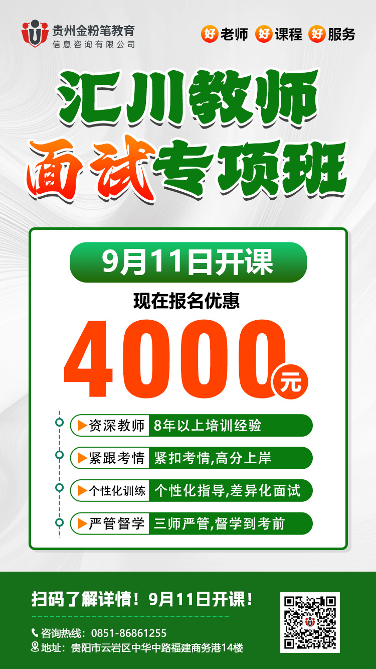 贵州金粉笔25年遵义汇川区教师面试班优惠活动来了,9月11日开课,在开课前预约或报班,可享最大面试课程优惠,遵义汇川区教师面试班预约或咨询:13368515037(微同)。