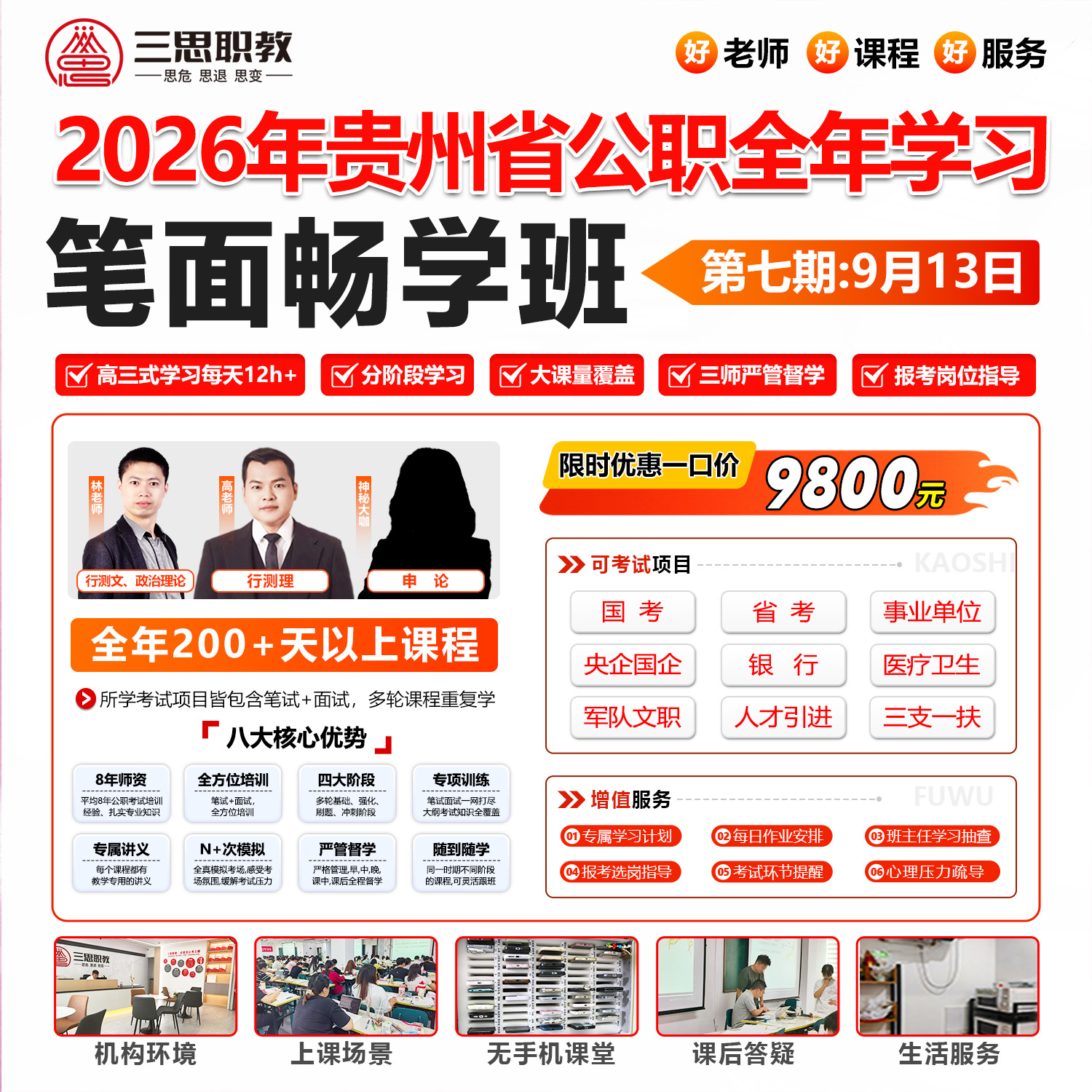 贵州三思职教2026年国考笔试班优惠来了,第七期笔试班9月13日开课。国考+省考+事业单位笔试考试,一年均可学,上岸机会更多,越早报名学习,课时更多更划算。2026年公考笔试课程预约及咨询:13378508157(微同)。