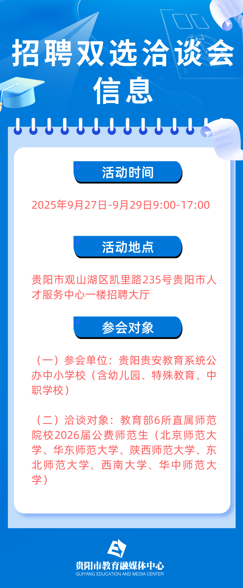 为进一步优化贵阳贵安教育系统人才队伍建设,助推贵阳贵安教育事业持续高质量发展,搭建优质教育人才与用人单位之间高效交流平台,贵阳市教育局将举办线下“贵阳贵安教育系统公费师范生招聘双选洽谈会”。