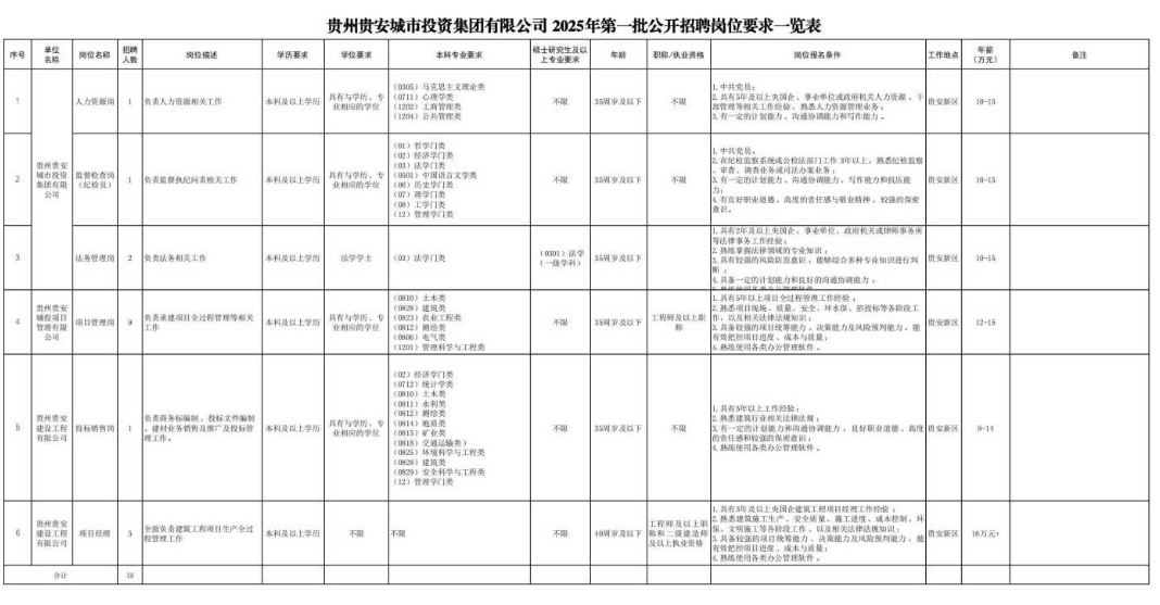 招聘计划共计6个岗位19人,详见附件《贵州贵安城市投资集团有限公司2025年第一批公开招聘岗位要求一览表》。