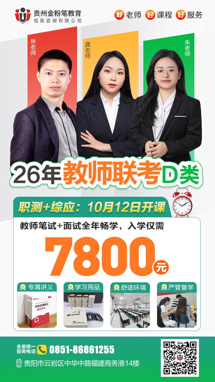 贵州金粉笔教育2026年贵州事业单位联考笔试班第一期25年10月12日开课,职测+综应(D类),教师笔试+面试全年畅学,入学仅需7800元,专属讲义,紧跟贵州联考考情,严管督学(主讲老师+班主任+督学跟班老师+教务老师督学),联考D类早准备,早学习,26年贵州事业单位联考D类笔试培训班预约或咨询:13368515037(微同)。