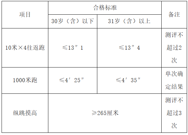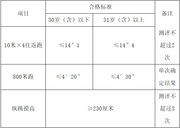 资格复审合格人员全部进入体能测评。体能测评项目和标准参照中组部、公安部关于印发《公安机关录用人民警察体能测评项目和标准的通知》(公政治〔2024〕60号)等有关规定执行,体能测评采取合格制,任一项目不合格者不能进入面试环节。
