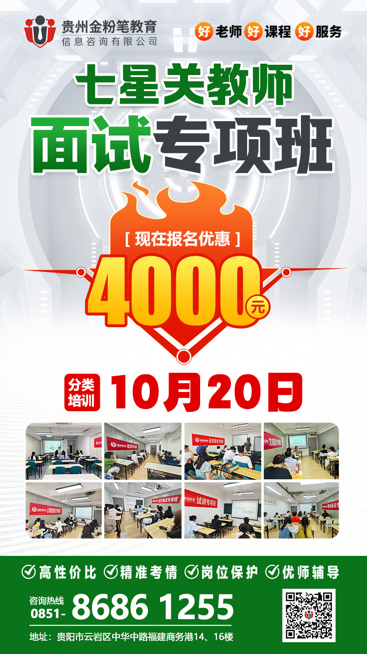 贵州金粉笔2025年毕节七星关区教师面试培训班优惠,开课时间10月20日,分科培训,在开课前预约或报班,可享最大课程优惠,七星关区教师面试班预约或咨询:13368515037(微同)。