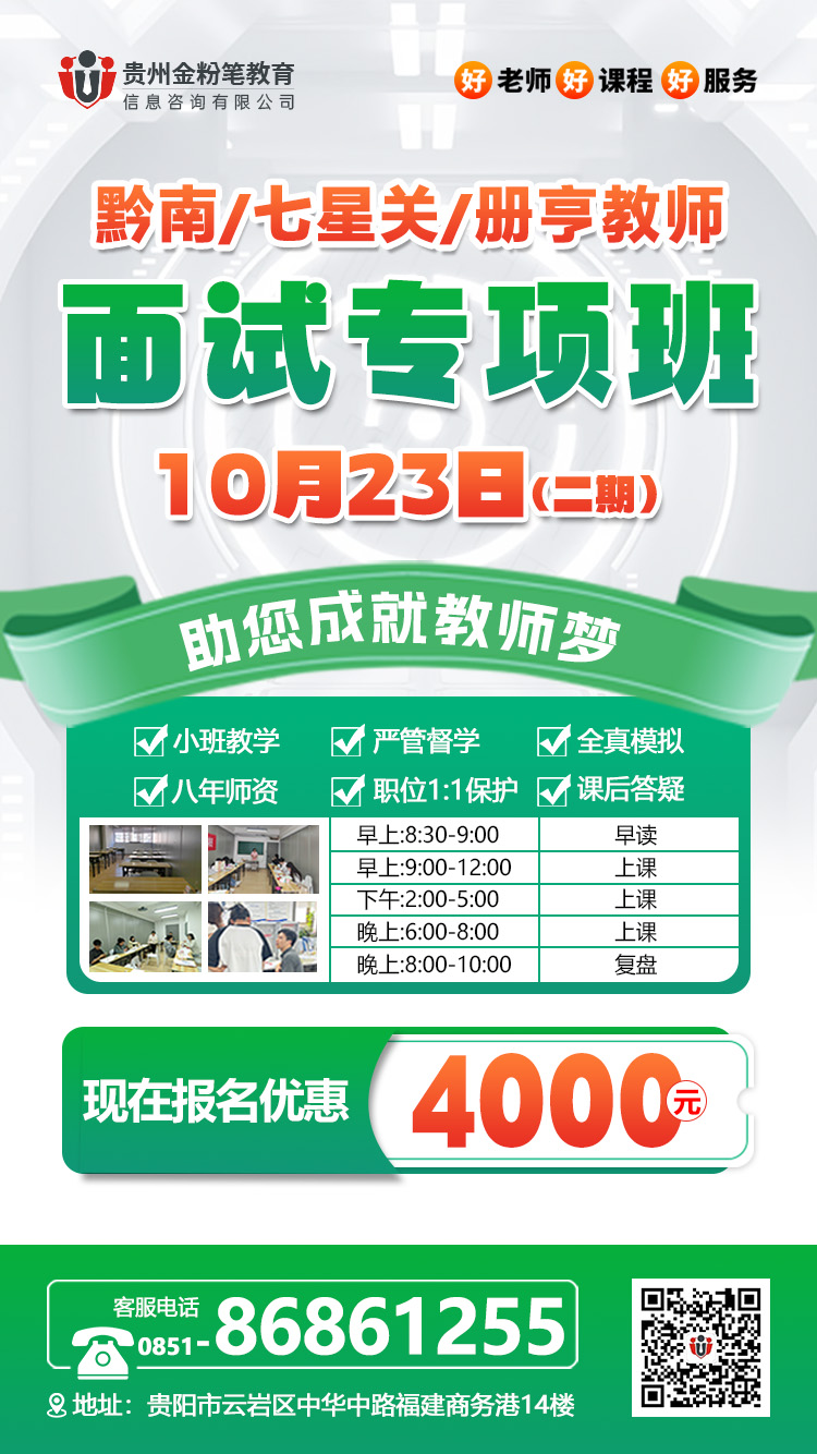 贵州金粉笔2025年黔南州教师、七星关区教师、册亨县教师面试班优惠活动来了,教师面试班第二期10月23日开课,在开课前预约或报班,可享最大课程优惠,黔南州教师、七星关区教师、册亨县教师面试班预约及咨询:13368515037(微同)。