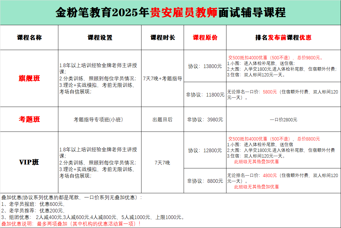 贵州金粉笔2025年贵安新区雇员教师面试培训班来了,笔试排名公布后开课,8年以上资深讲师主讲,讲练考相结合。贵安新区雇员教师面试班预约及咨询:13368515037(微同)。