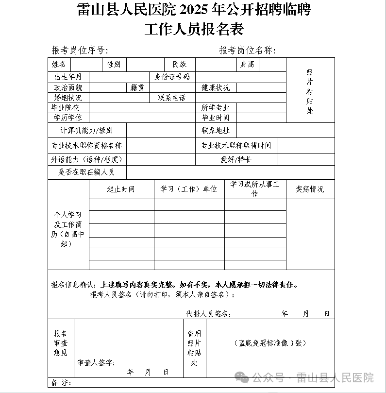 2.雷山县人民医院2025年公开招聘临聘工作人员报名表