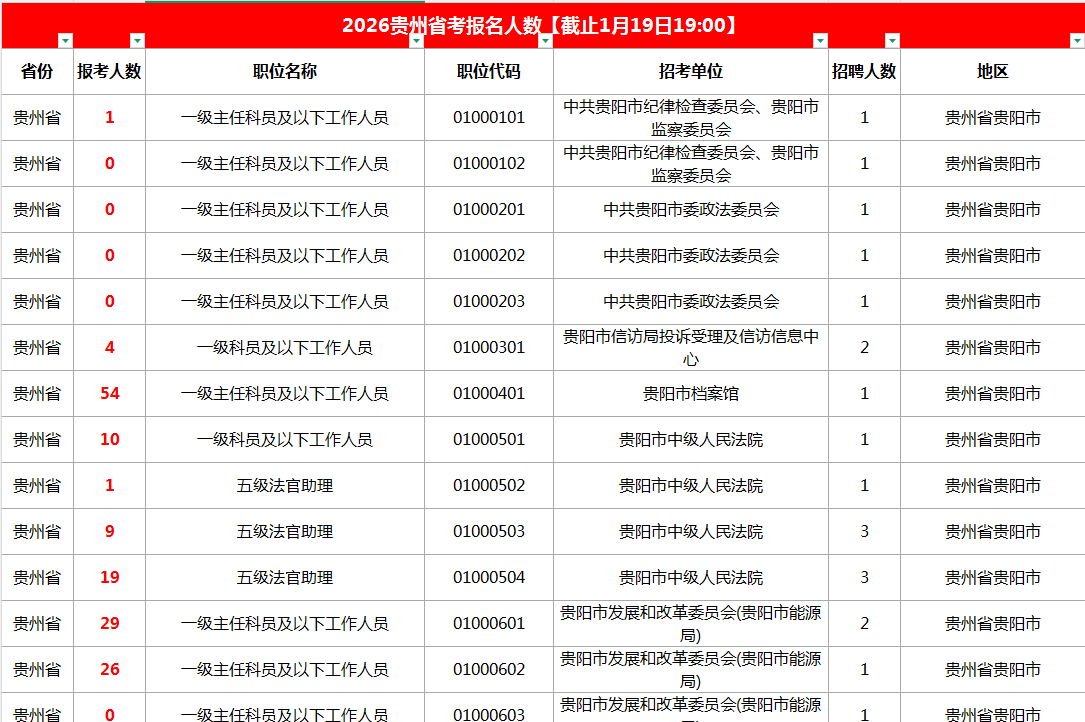 截至2026年1月19日19:00,贵州省考全省报名过审人数18067人,无人报考岗位还剩1352个。