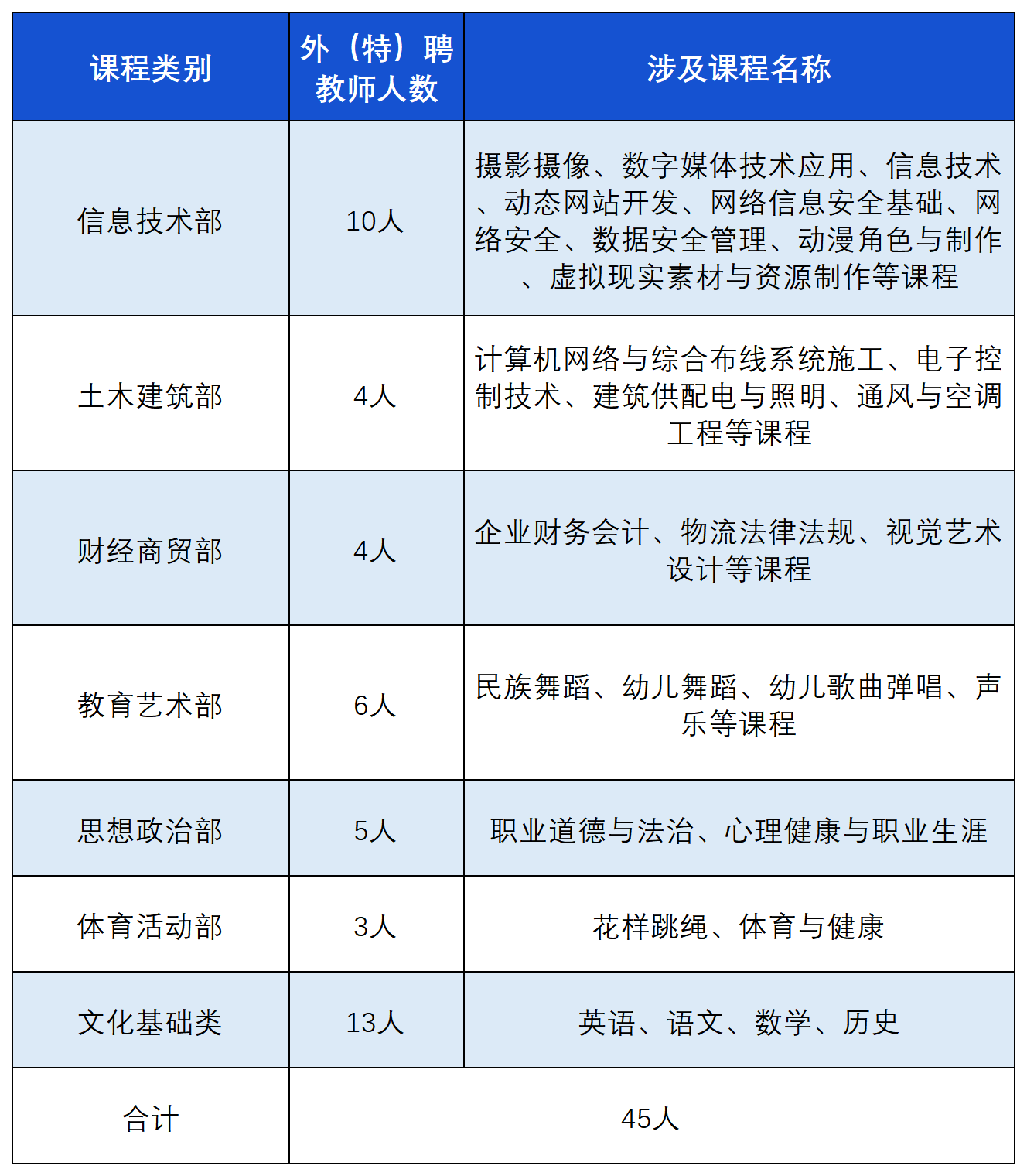 根据《职业学校兼职教师管理办法》(〔2023〕9号),结合我校《外(特)聘教师管理办法》,为缓解学校紧缺骨干专业教师及文化基础课教师不足问题,引进优秀教育(企业)人才以满足学校教育教学工作需要,现面向社会招聘外(特)聘教师。